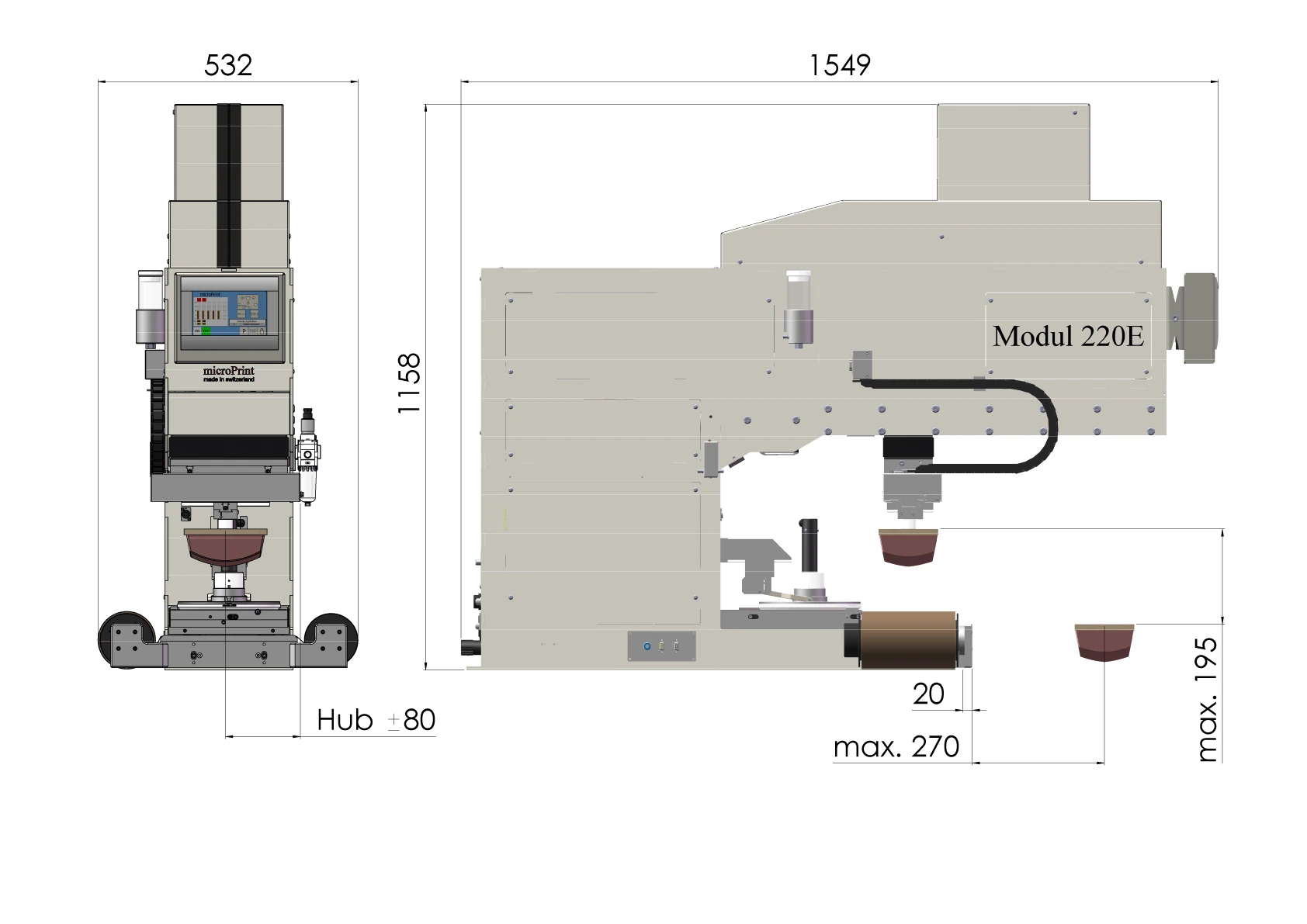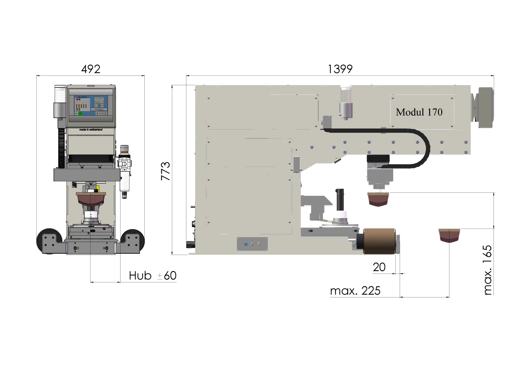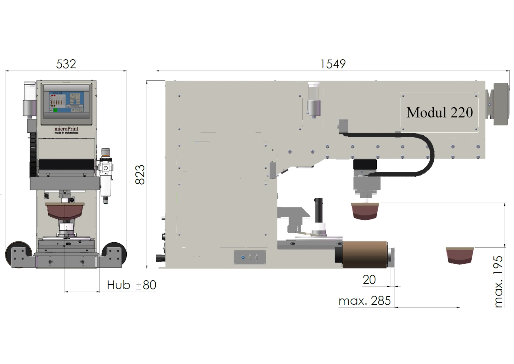 Die Maschinen der Modul-Linie sind einfarbige Tampondruckmaschinen. Sie arbeiten mit einem geschlossen Farbgeber. Die maximale Topfgröße beträgt 200 mm. Der Anpressdruck der magnetischen Rakeltöpfe kann auf Wunsch mit pneumatischer Halterung verstärkt werden. Bei Bedarf ist es möglich die Modul in einer Spezialvariante auch mit 2 Töpfen auszustatten. Mit dem optionalen microPrint Viskomaten ausgerüstet, wird die Viskosität im Topf automatisch selbstreguliert.