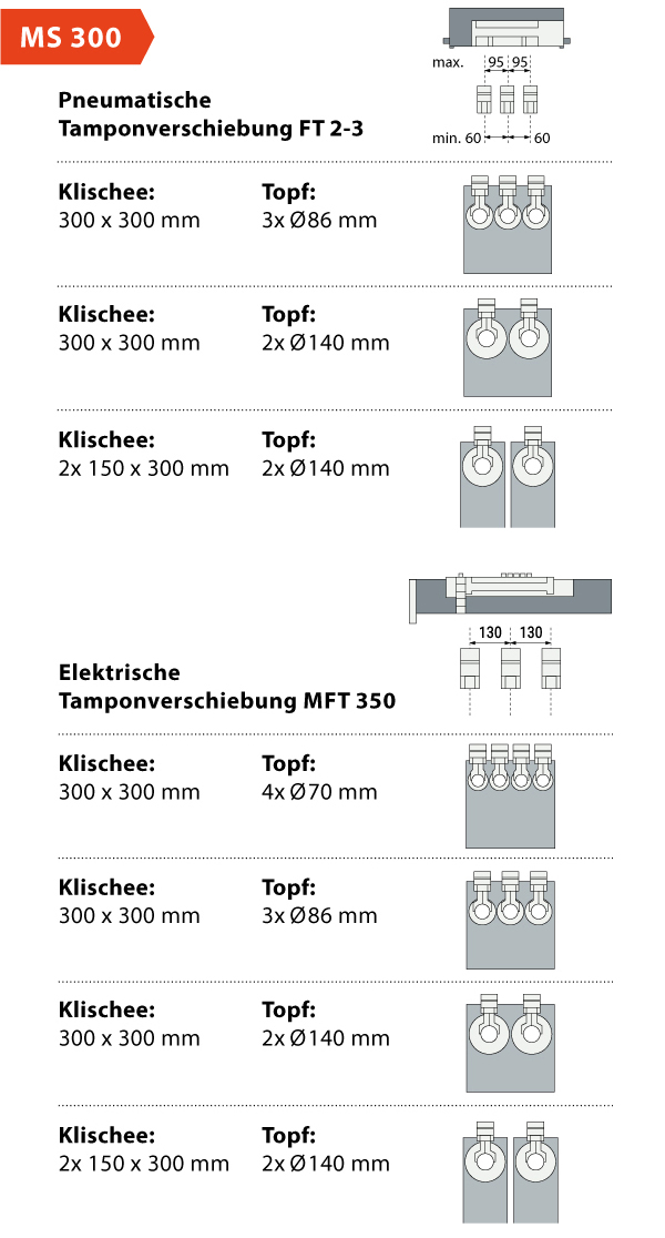 Die Tamponposition in Y-Achse wird pneumatisch angefahren und kann für die Farbaufnahme und -abgabe intern mechanisch eingestellt werden. Die X-Position sowie die Winkelkorrektur wird über den Klischeehalter vorgenommen. Mit der pneumatischen 3-Farben-Tamponverschiebung wird das Druckbild, ob 2- oder 3-farbig, immer zentrisch abgegeben. Die elektrische Tamponverschiebung kann bis zu 4 Farben an beliebigen X-Positionen übertragen. Es kann wahlweise mit einer Tamponkombination oder einem einzelnen Tampon gearbeitet werden.