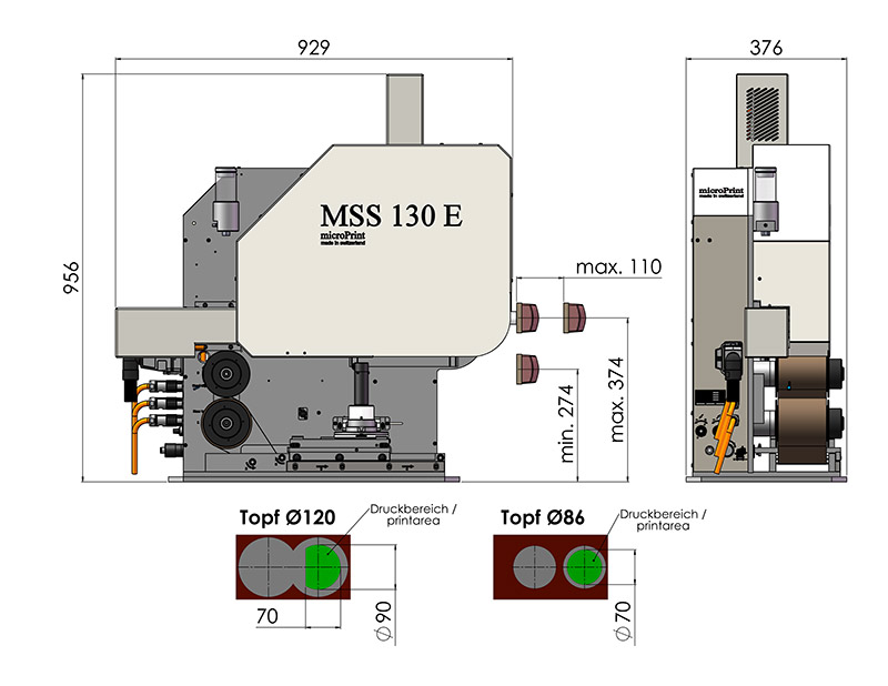 pneumatischen Version kann der Tampon um 90° gedreht werden, während bei der elektrischen Version ein Winkel von 0° bis 90° frei einstellbar ist. Dies ermöglicht die Bedruckung vertikaler Flächen, insbesondere in Produktionslinien, in denen das Druckgut nicht oder nur mit großem Aufwand gedreht werden kann. Die Tampondruckmaschinen sind bequem von der Rückseite aus bedienbar, was eine komfortable Handhabung und optimale Zugänglichkeit gewährleistet. Ein Herausziehen oder Drehen der Maschine ist nicht notwendig. Bei der pneumatischen Version wird die Positionskorrektur mechanisch über den Klischeehalter vorgenommen. In der elektrischen Variante erfolgt die Einstellung der Druckposition elektronisch über ein Display. Mehrere Bildpositionen auf dem Klischee können angesteuert werden, und zudem sind die Höhe, der Druckwinkel sowie eine Verweilzeit des Tampons auf dem Produkt flexibel einstellbar. Zusätzlich sind verschiedene Spezialversionen verfügbar, darunter die besonders kompakte MSS 60.