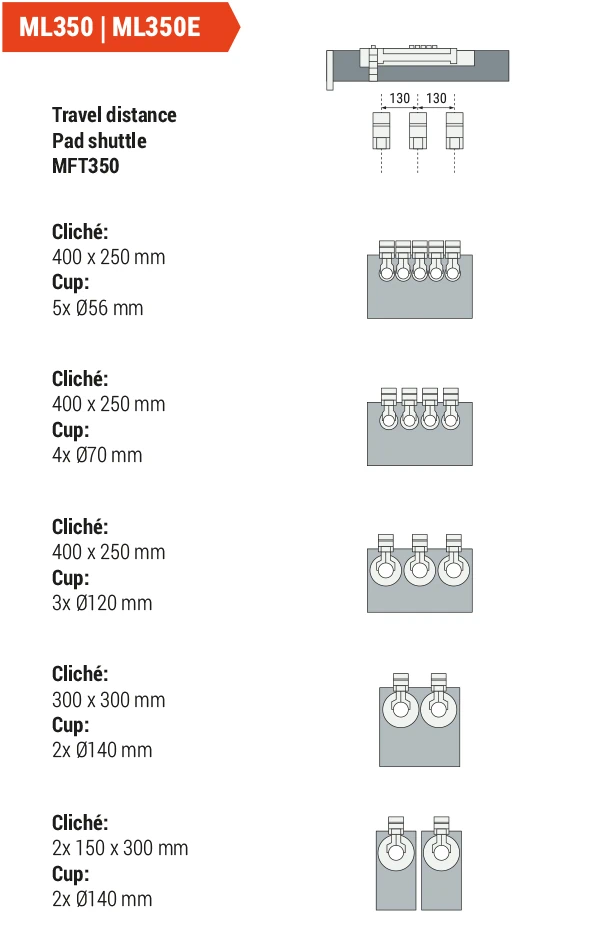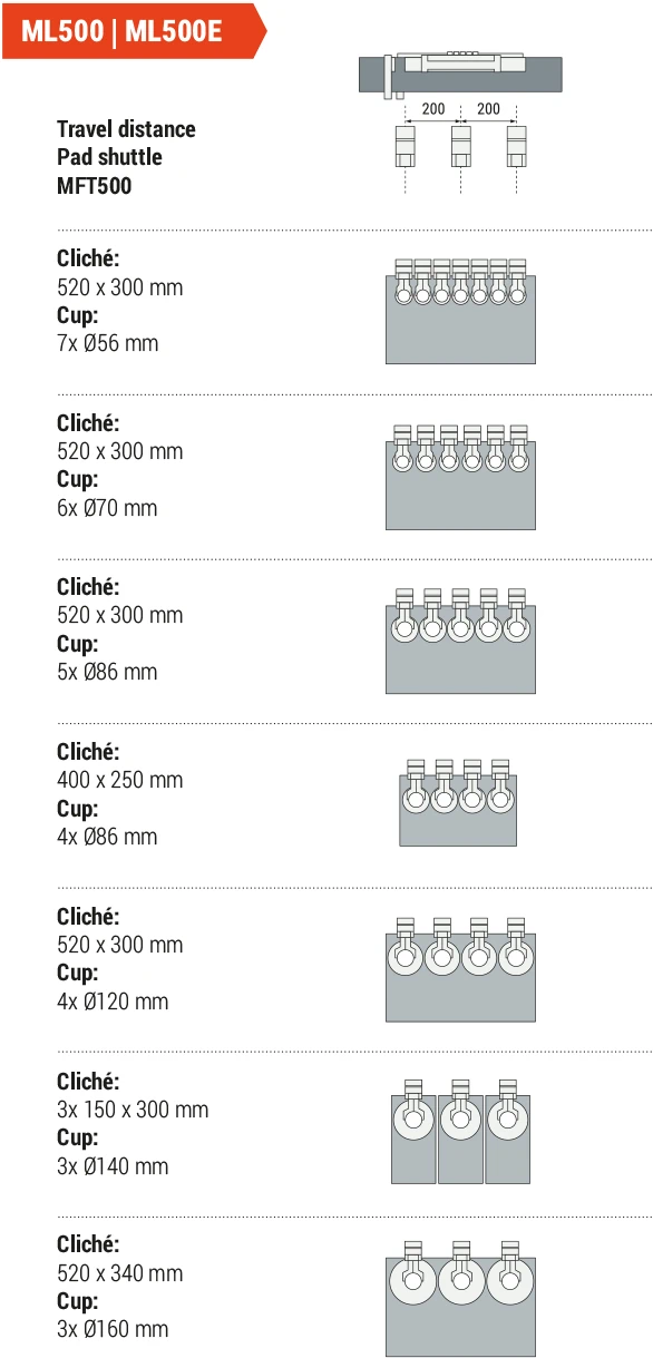 The ML line features multicoloured pad printing machines with electric positioning and an optional