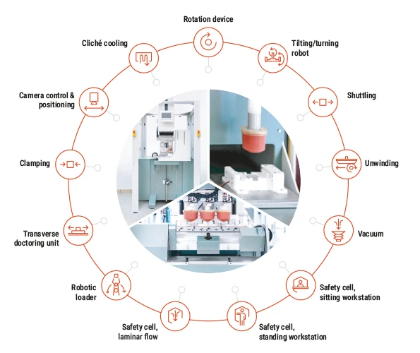 For standalone operation within a system, we recommend at least pad cleaning control and the Viscomat. For top requirements regarding product safety, filling level gauges for both units may be added, as well as additional sensors for temperature and humidity. Cliché cooling is available to minimise temperature effects on colour transfer time and on the ink’s pot life. Safety cells can be specially designed for sitting or standing workstations. These can be equipped with an additional rotary indexing table and a laminar flow to minimise dust.