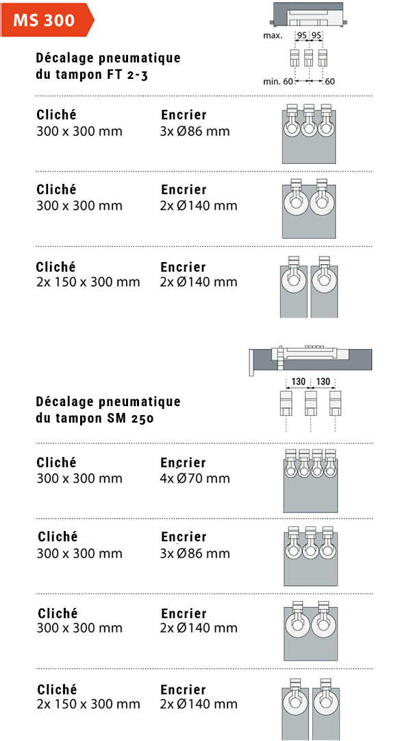 Le positionnement du tampon dans l’axe Y se fait par entraînement pneumatique et permet de régler mécaniquement en interne la position de prise d’encre et de transfert d’encre. Vous pouvez régler la position dans l’axe X et corriger l’angle à partir du support de cliché. Le décalage pneumatique du tampon 3 couleurs permet de toujours obtenir une image imprimée centrée, que cela soit avec 2 ou 3 couleurs. Le décalage électrique du tampon est capable de transférer jusqu’à 4 couleurs à différentes positions X. Au choix, vous pouvez travailler avec une combinaison de tampons ou un seul tampon.