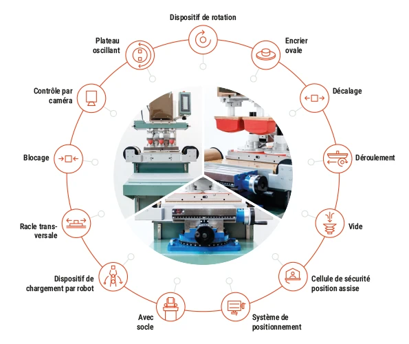 La manutention des pièces peut être réalisée de manière flexible. Outre la rotation pneumatique et la rotation électrique sur un seul axe, il est aussi possible de décaler les pièces au moyen d’un entraînement pneumatique ou électrique. Un dérouleur pneumatique à crémaillère permet d’imprimer des formes rondes. La pièce à imprimer peut être maintenue par des pinces pneumatiques ou par aspiration. Vous pouvez au choix connecter un système de détection des pièces par aspiration ou par des capteurs.