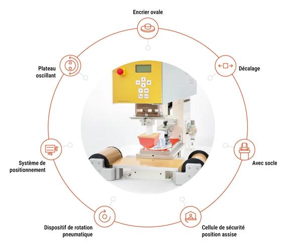 L’objet à imprimer doit être inséré manuellement dans le support et positionné au moyen du système de positionnement. L’impression bichrome est possible avec un seul tampon dans les cas où il n’est pas possible d’imprimer en 2 couleurs avec une combinaison de tampons en raison de bords de collision. Vous pouvez imprimer plusieurs côtés de l’objet grâce à la rotation pneumatique sur un axe. Un plateau oscillant permet d’insérer la pièce suivante pendant le processus d’impression.